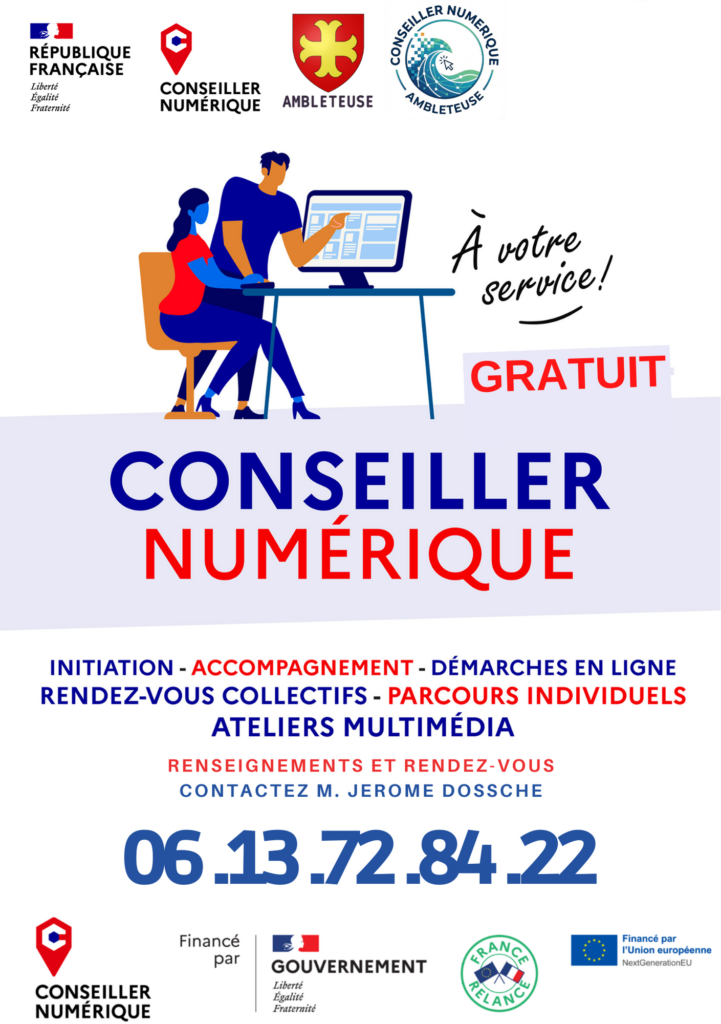 La municipalité d’Ambleteuse a donc souhaité rapprocher le numérique du quotidien des Ambleteusois et les accompagner vers l’autonomie numérique en s’inscrivant dans le dispositif « Conseillers Numériques France Services ». Il propose les services d’un conseiller numérique qui recevra les habitants sur rendez-vous individuels et/ou les accompagnera sur une mini-formation en ateliers afin de leur permettre de s’approprier progressivement les usages numériques du quotidien.