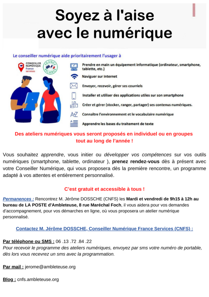 Permanences : Rencontrez M. Jérôme DOSSCHE (CNFS) les Mardi et vendredi de 9h15 à 12h au bureau de LA POSTE d’Ambleteuse, 8 rue Maréchal Foch, il vous aidera pour vos demandes d’accompagnement, pour vos démarches en ligne, où vous proposera un atelier numérique personnalisé.